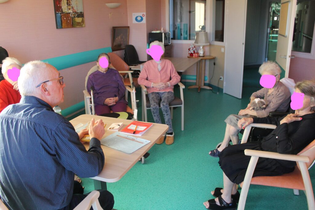 Entourés d’un personnel globalement très présent, nous sommes heureux de contribuer à égayer un peu la vie des résidents qui nous écoutent, réagissent de temps à autres aux lectures, et avec qui nous avons noué des relations chaleureuses.